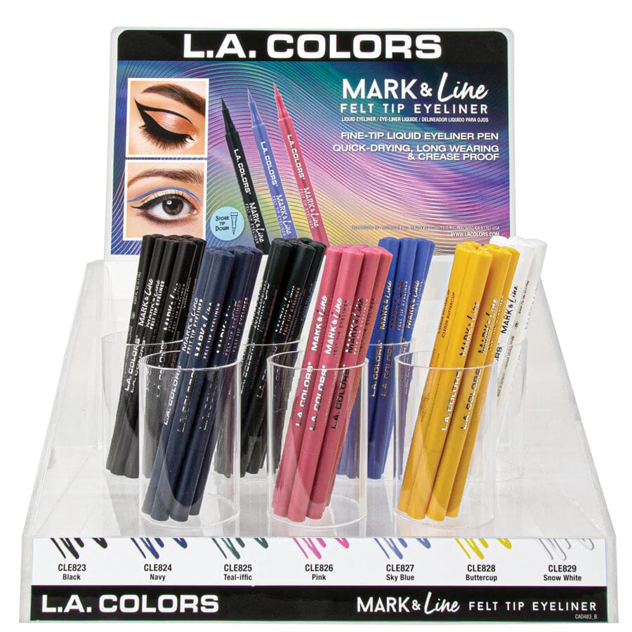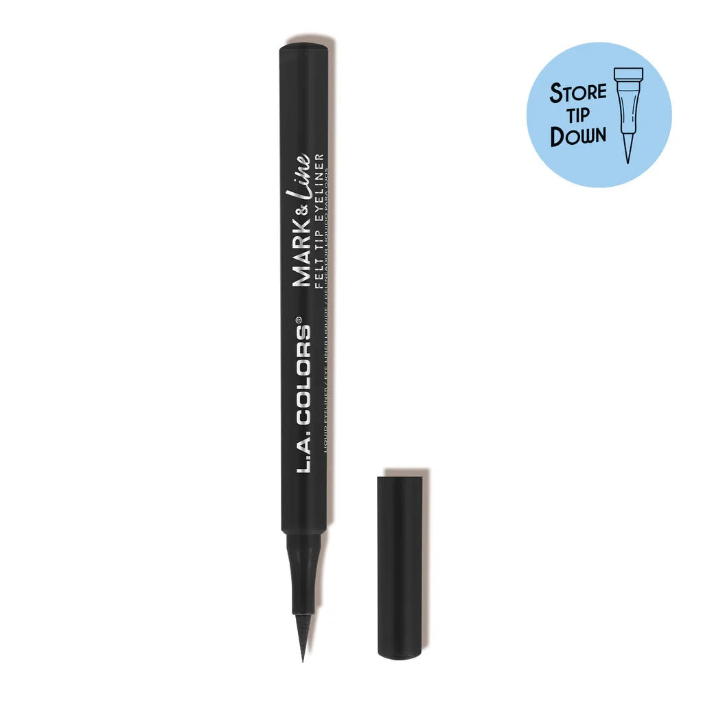 Make your mark with the Mark & Line Felt Tip Eyeliners. This super smooth, fluid formula glides on effortlessly to create pigmented lines that won’t crack or flake and dries down matte. The felt tip makes it easy to draw out thick or thin lines in a range of fun colors that stand out from the crowd. Not only do your lines dry down fast, but we made sure to make it last with a long-wearing formula that is water resistant and smudge-proof. For a quick cat eye on the go, you can use the soft, tapered felt tip as stamp for your wing. Just hold the liner parallel to your eye and stamp on the outer corner, then connect it by lining your eye as usual. For best results store standing up with the tip facing down.