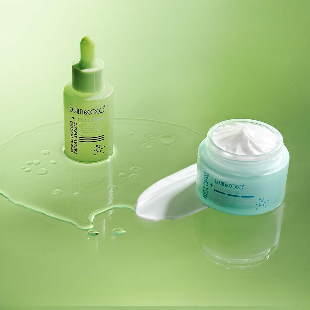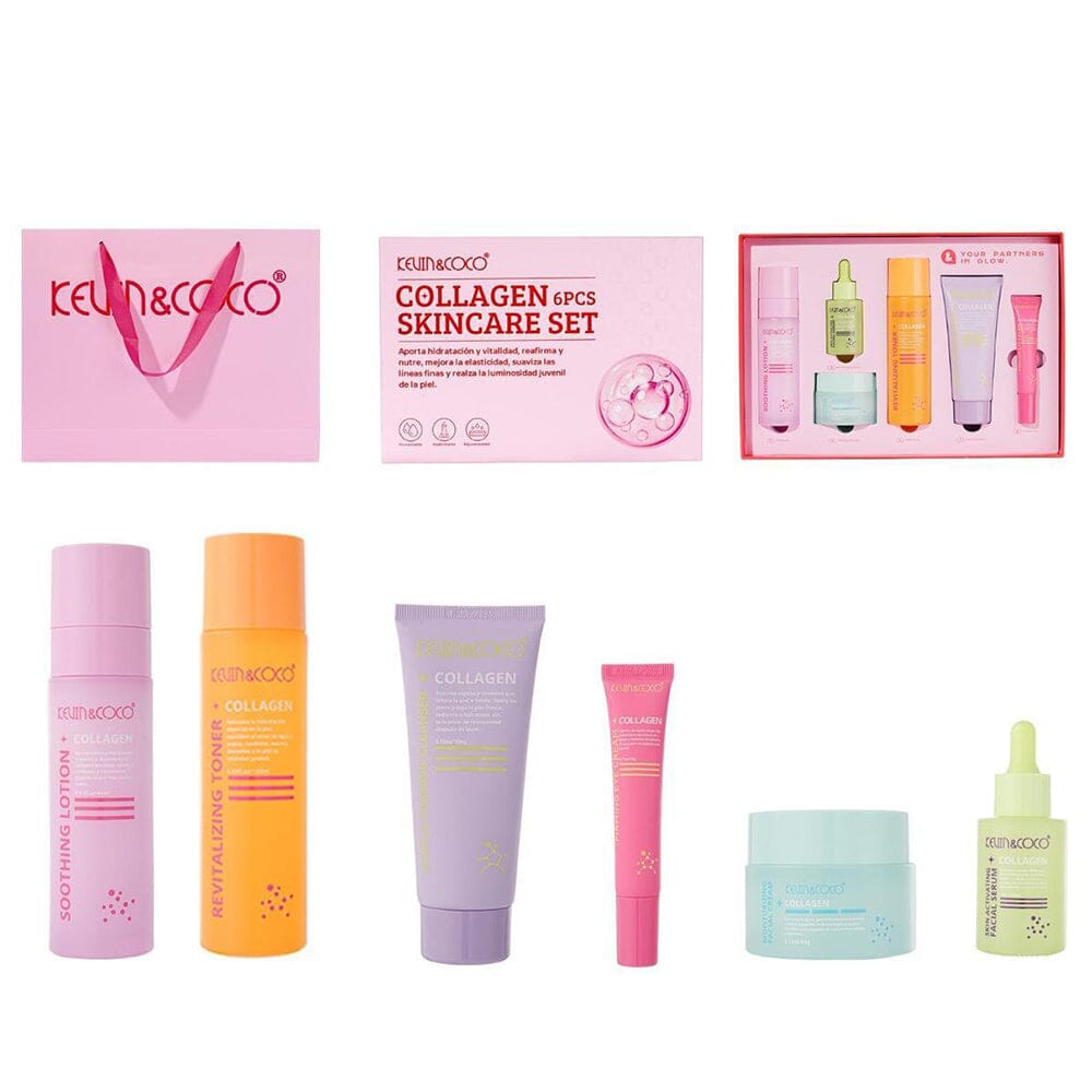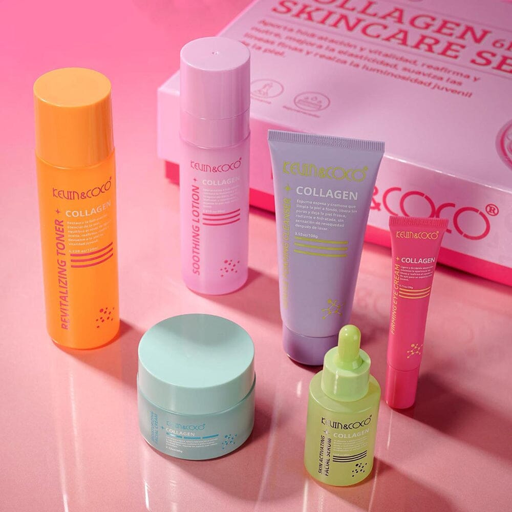 The Collagen Rejuvenation Collection is a comprehensive 6-step daily skincare regimen designed to combat the visible signs of aging and promote a plumper, more youthful complexion. This synergistic suite—featuring Cleanser, Toner, Eye Cream, Serum, Moisturizer, and Nourishing Cream—works in harmony to deeply hydrate, reinforce skin's natural elasticity, and diminish the appearance of fine lines and wrinkles. Formulated with advanced collagen complexes and supporting nutrients, it restores skin's bounce and radiant vitality.