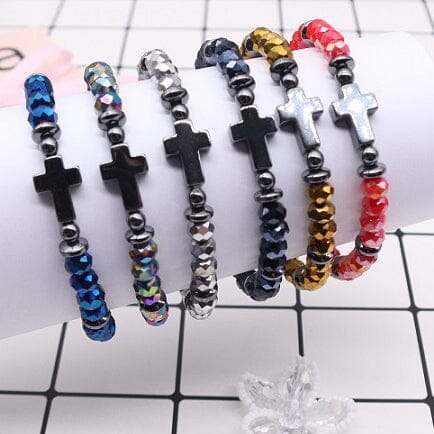This cross charm bracelet features faceted crystal beads that catch the light beautifully, paired with sleek metallic accents for a modern, stylish finish.